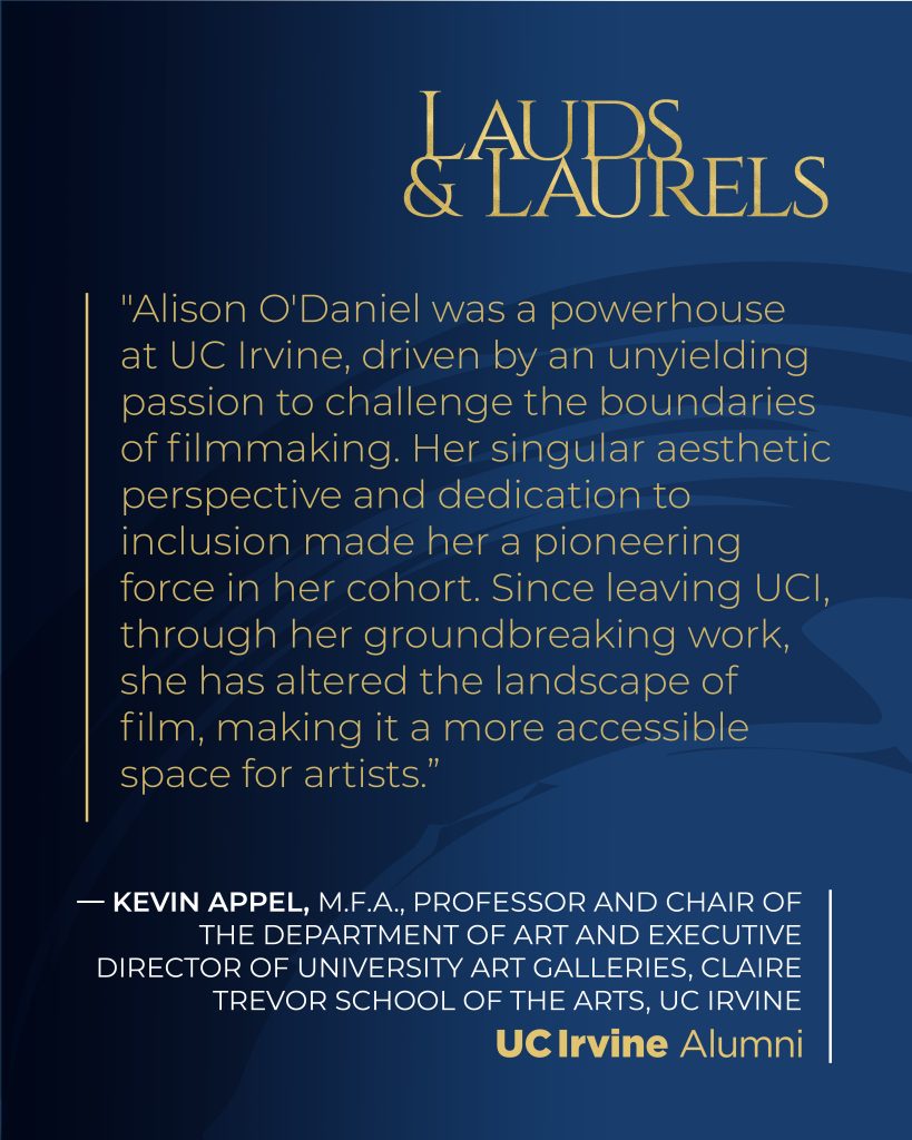 An acclaimed visual artist and filmmaker, Alison O’Daniel is this year’s recipient of the Distinguished Alumni Award from the Claire Trevor School for the Arts. Tiffany López, Claire Trevor Dean of the Arts, has described Alison as “an outstanding model of UC Irvine’s mission of research, teaching and creative expression.”