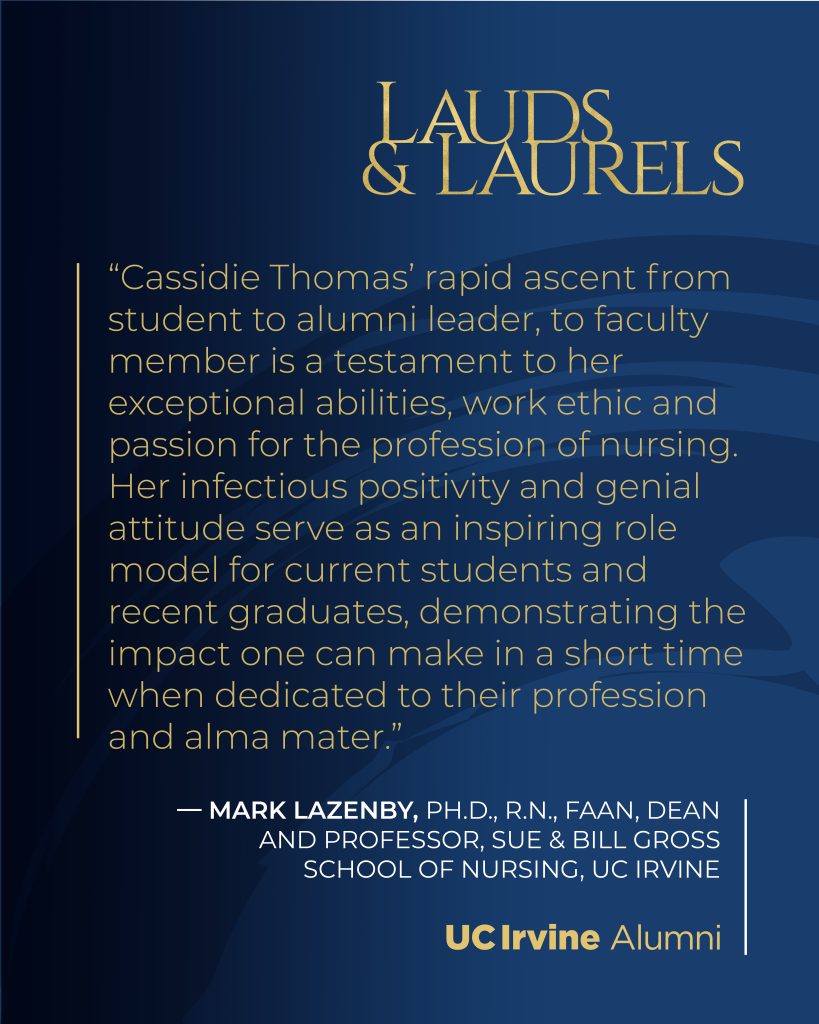A nurse, teacher, researcher, mentor, role model and passionate advocate for the nursing profession, Cassidie Thomas is this year’s recipient of the Sue & Bill Gross School of Nursing’s Distinguished Alumni Award.