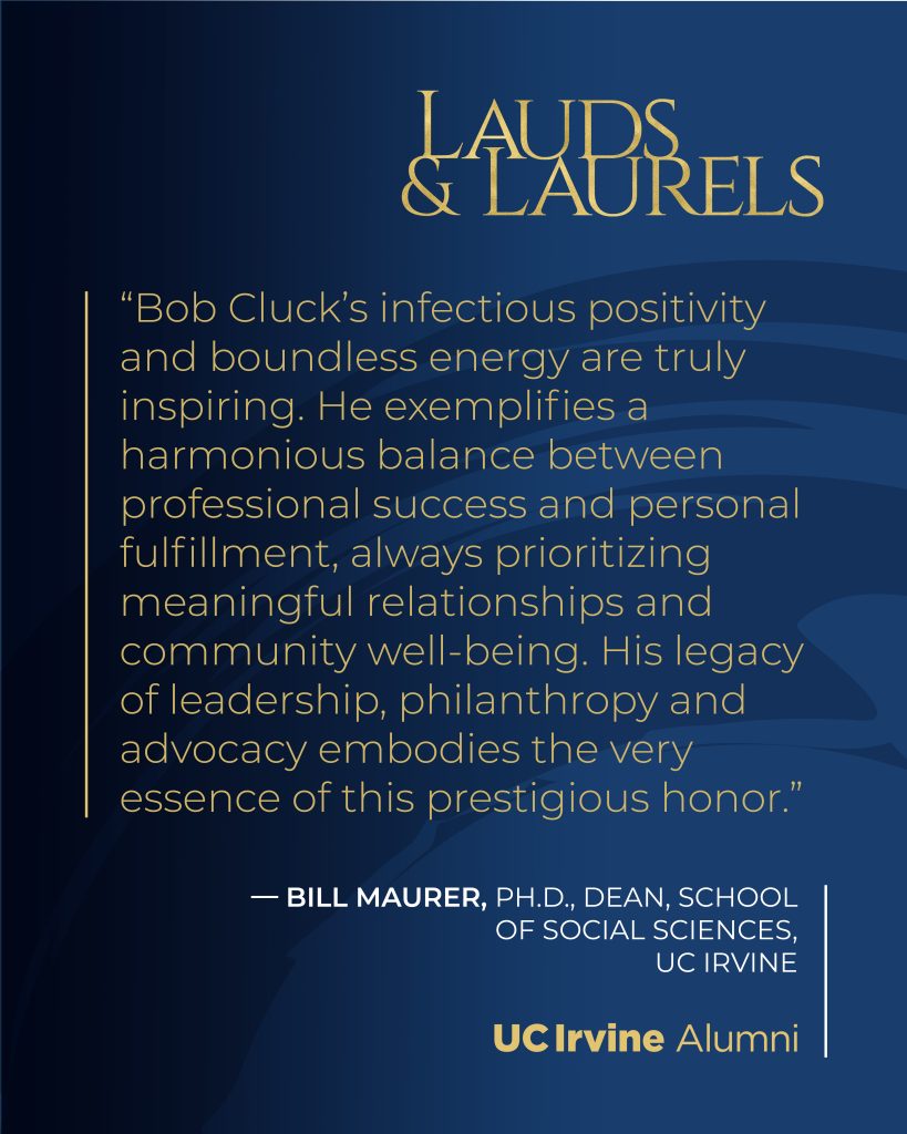 An exceptionally committed Anteater, D. Robinson “Bob” Cluck is this year’s recipient of the Distinguished Alumni Award from the School of Social Sciences. According to the lyrics of a song a friend wrote for Bob’s 60th birthday, the “u” in Cluck stands for “UC Irvine.”