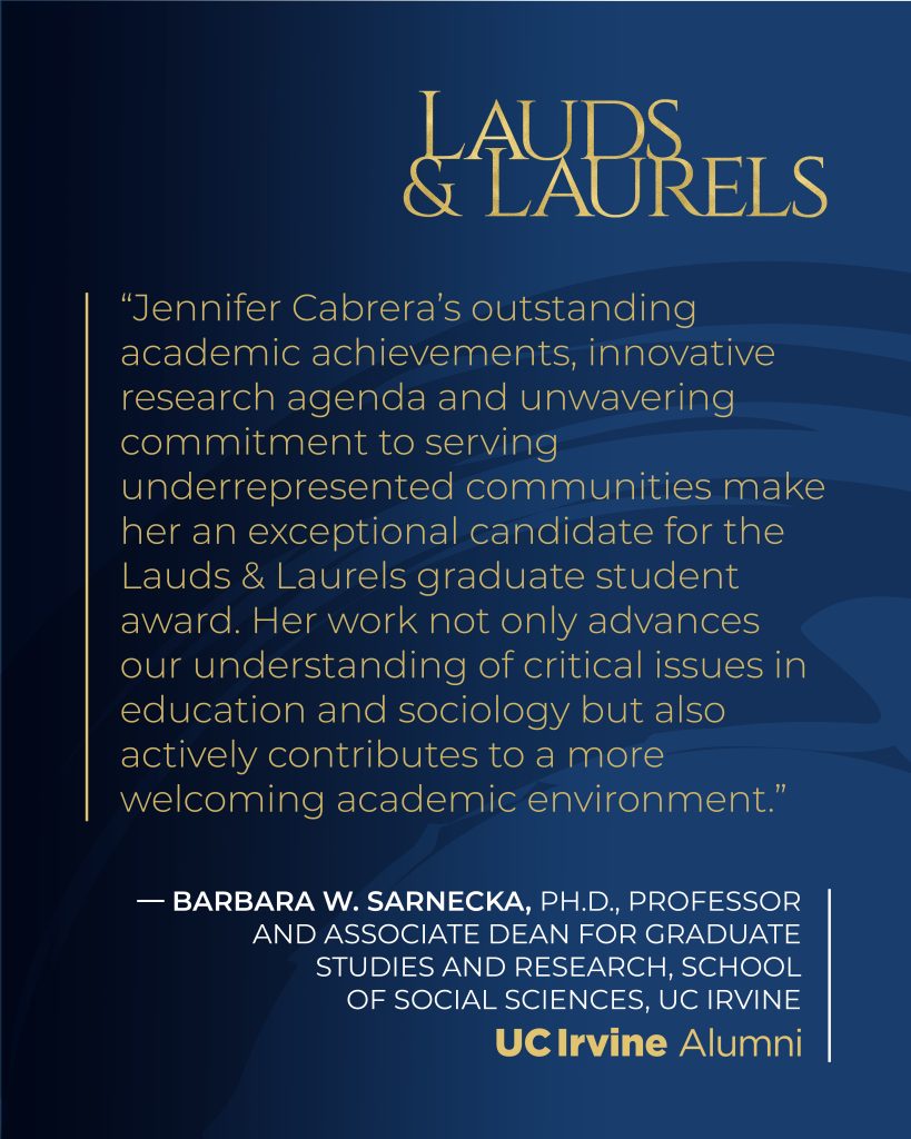 Beyond her extensive research contributions, which include publications in journals such as Social Networking and Race Ethnicity and Education, Jennifer is dedicated to service within the UC Irvine community. She has mentored more than 75 first-generation college students through the Competitive Edge Summer Research Program, the Research Discovery Program, and the Summer Undergraduate Research Program. Her work with DECADE, a program for graduate students, earned her the “Outstanding DECADE Representative” award from the UC Irvine Graduate Division.