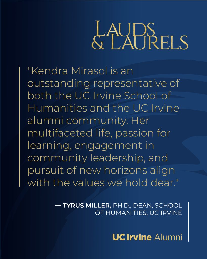 Described as an “advocator for the humanities” and an “exceptional human being and contributor to society,” it’s easy to understand why Kendra Mirasol is this year’s recipient of the Distinguished Alumni Award from the School of Humanities. Originally from Wisconsin, she spent a year at the University of Wisconsin before transferring to UC Irvine after her mother passed away – a “reset” of her life that would lead her on an inspiring journey of personal growth and professional excellence.