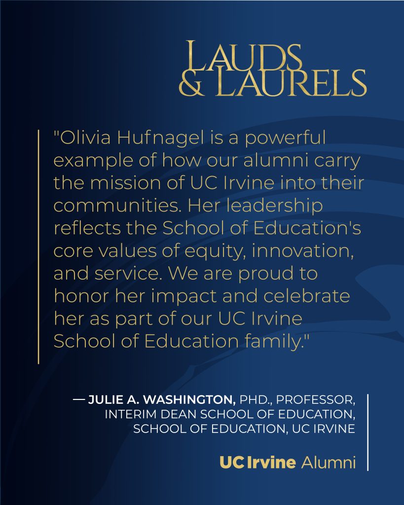 Olivia credits her mentor Mary Roosevelt, a recipient of the UC Irvine Lauds & Laurels Award for University Service in 1984 and the UC Irvine Medal in 1990, for recognizing and affirming her Latina heritage, biculturalism and biliteracy as valuable assets in her journey towards becoming an educator. Committed to instilling the same sense of confidence and empowerment in her elementary school students as all her mentors instilled in her, Olivia started a tradition of taking her students on a UC Irvine campus tour – a chance to share her story and motivate them to see college as a real option.