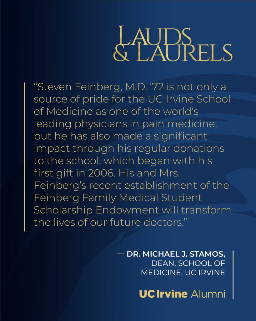 A generous supporter of UC Irvine, Steven and his wife, Helen “Erica” Feinberg, have donated more than $1 million to the School of Medicine. Most recently, they established the Feinberg Family Medical Student Scholarship Endowment and plan to contribute further to the fund as part of their ongoing philanthropic support of the school.